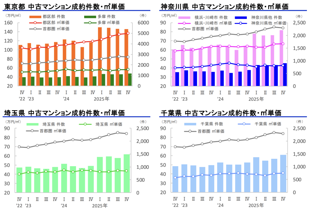 首都圏や近畿圏の中古住宅は、平均価格ベースではいまだ上昇傾向にありますが、首都圏では東京23区や、近畿圏では大阪市が価格上昇を牽引している構図です。他県や交通利便性が低いエリアでは、すでに価格調整局面に入りつつある地域も見られます。